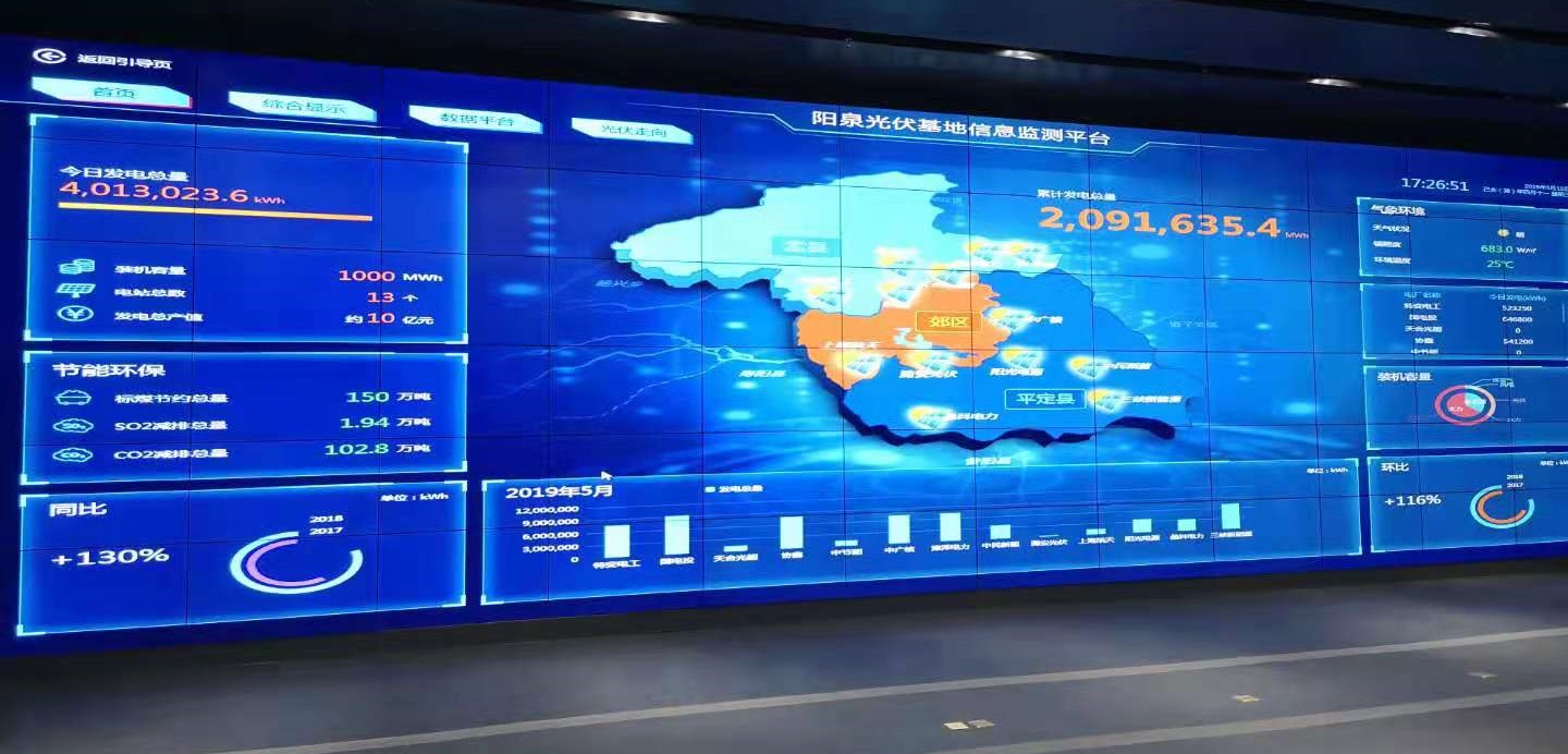 信息平臺(tái)匯集了光伏領(lǐng)跑者項(xiàng)目十三家投資商的實(shí)時(shí)發(fā)電數(shù)據(jù)、地理位置、具體信息。整個(gè)項(xiàng)目裝機(jī)容量為1000MW(兆瓦),年發(fā)電總產(chǎn)值約10億元。以及在建和列入開發(fā)方案的共計(jì)48萬千瓦風(fēng)電項(xiàng)目。為拓寬平臺(tái)的服務(wù)領(lǐng)域,實(shí)現(xiàn)平臺(tái)的綜合化利用,該平臺(tái)除實(shí)現(xiàn)對(duì)光伏基地整體運(yùn)行情況的實(shí)時(shí)監(jiān)測(cè)外,還可以通過可視會(huì)議系統(tǒng),實(shí)時(shí)連線重點(diǎn)工程情況。